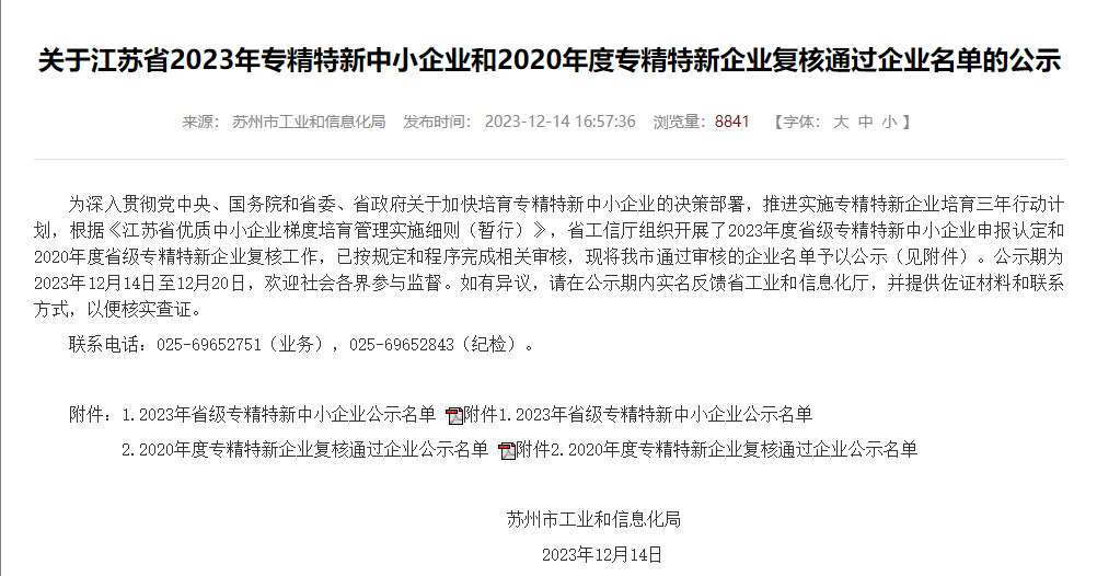 2023年12月14日,蘇州市工業(yè)和信息化局正式公布2023年江蘇省“專精特新”中小企業(yè)公示名單,目前公示已結(jié)束,蘇州六六視覺科技股份有限公司榮獲江蘇省“專精特新”中小企業(yè)榮譽(yù)稱號(hào)。